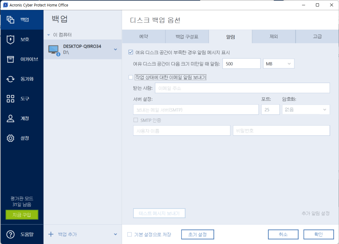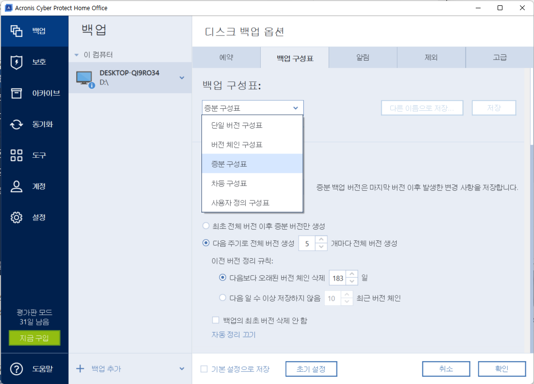 옵션에서 세부 백업 옵션들을 설정할 수 있다.