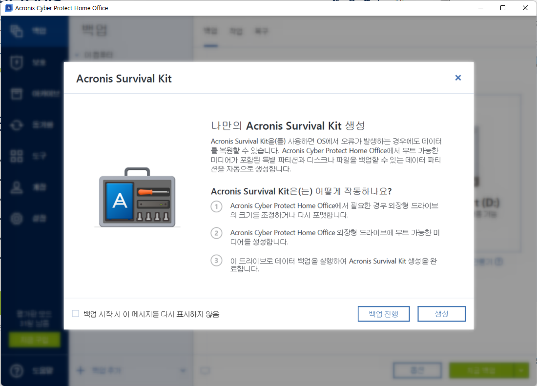 하지만 난 그냥 백업 진행 선택