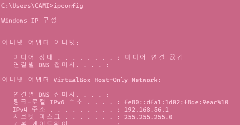 현재 사용중인 윈도우 터미널에서 VirtualBox Host-Only Network 인터페이스의 IP 주소를 확인한다 (192.168.56.1)