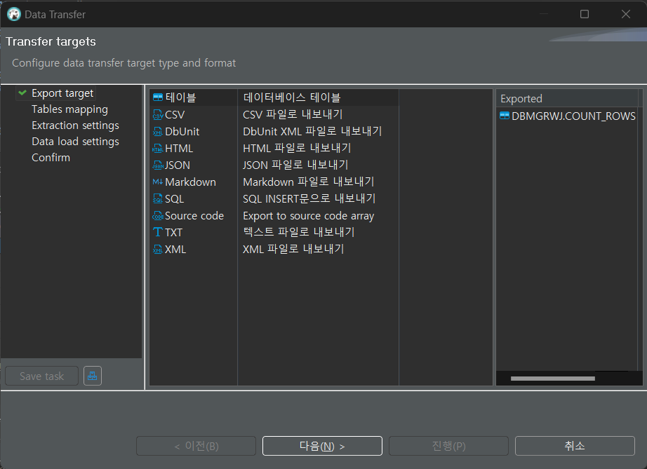 원하는 스키마 > 테이블 우클릭 > 데이터 내보내기