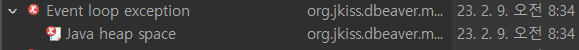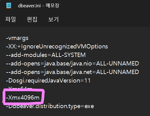 dbeaver.ini 파일의 Xmx 파라미터가 1024m 였는데 이걸 4096m으로 수정함