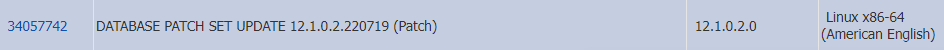 | PATCH | GI : 34204576 (12.1.0.2.0) DB : 34057742 (12.1.0.2.0) |