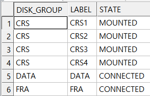SELECT A.NAME DISK_GROUP, D.NAME LABEL, A.STATE