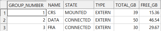 SELECT GROUP_NUMBER, NAME, STATE, TYPE, ROUND(TOTAL_MB/1024,2) TOTAL_GB, ROUND(FREE_MB/1024,2) FREE_GB