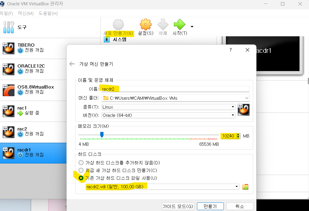 | racdr2 | racdr2 | 10GB | 어댑터에 브리지 | 호스트 전용 어댑터 | RAC 복제 |