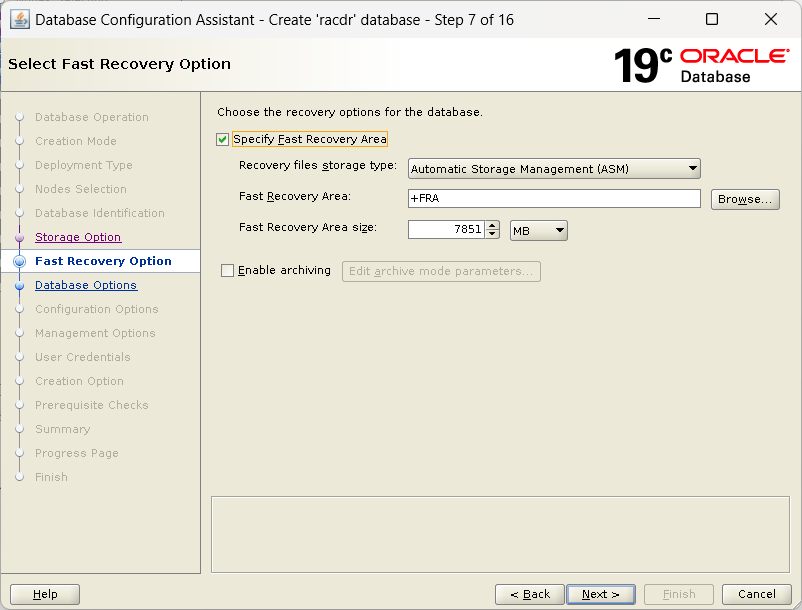 빠른 복구 영역 지정 , 아카이브로그 모드 사용 (ADG 구축에 필요함 / 추후 변경 가능)