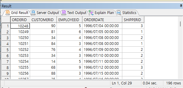 ORDERID CUSTOMERID EMPLOYEEID ORDERDATE SHIPPERID