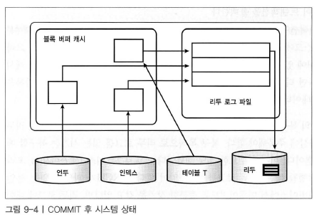 변경된 언두 블록, 인덱스 블록, 테이블 블록이 조금씩 버퍼캐시에 캐싱되어 있고 각 블록은 리두로그버퍼에 있는 엔트리에 의해 보호된다.
